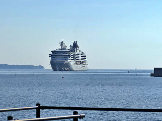 クルーズ船はゆっくりと港へ入ってきました。画像ではよく分りませんが、多くの乗船客が着岸の様子を見るためなのか?客室のデッキに出てこちらを眺めていました。そしてなかにはこちらに向かって手を振っている人もいました。