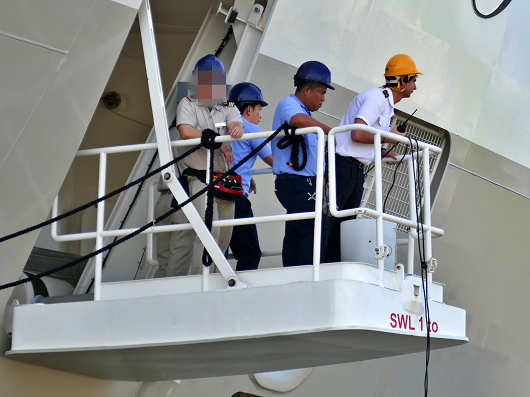 船上にはヘルメットを被った何人もの船員が姿を現していて、これから接岸作業が始まります。