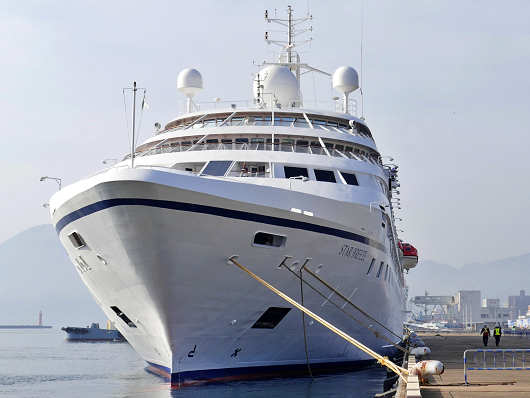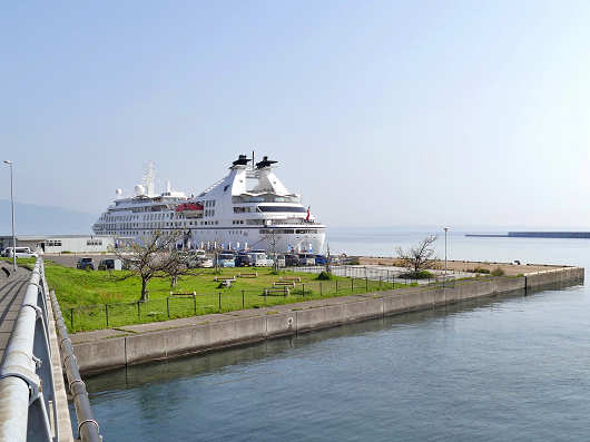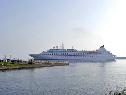 この時はクルーズ船の到着よりも早く港へ到着したので、しばらくクルーズ船が入港するのを待ちましたが、入港してきたクルーズ船は今まで見てきた外国船籍の船にしてはかなり小型のようでした。