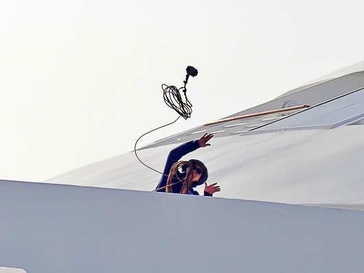 カメラを構えて待っていると、船上からヒービングラインが投げられました。クルーズ船の見物に出かけた時には毎回このシーンを撮影しますが、一瞬の出来事なのでなかなかうまく撮影ができないんですよね(笑)