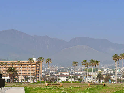 この日は黄砂がとても酷くて、別府国際観光港に到着して別府温泉の背後にそびえる鶴見岳を眺めたら、ぼんやりと霞んで見えました。