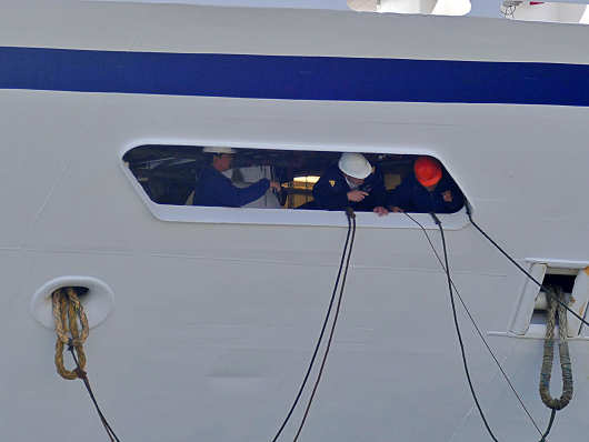 ゆっくりと港へ入って来たクルーズ船は、2隻のタグボートにエスコートされて岸壁に接岸しました。これから係留作業が始まるようですね。