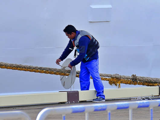 係留作業が終わったら、小動物(ネズミなど)の船内への侵入を防止するラッドガードの取り付けです。クルーズ船が接岸しても、乗船客が下船するまでには見えないところで色んな作業があるんですよね。