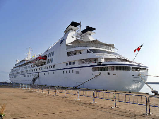 この日入港したのはアメリカのウィンド・スタークルーズ社が所有するクルーズ船の「スター・ブリーズ」です。船名の下には船籍があるバハマの首都の「NASSAU(ナッソー)」と書かれていました。先日別府へ寄港したクルーズ船の「シルバー・ウィスパー」と同じところですね。