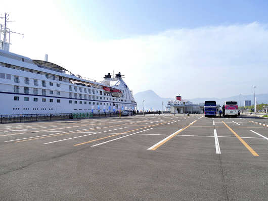クルーズ船の接岸している第4埠頭を見ると、普段は歓迎セレモニーの楽器演奏や踊りなどが披露されていますが、この日の岸壁には人の気配もほとんど無くて、観光に出かける乗船客を乗せる大型バスも2台が停まっているだけでした。外国からのクルーズ船の入港時にしてはとても寂しい、あまり見ない光景ですね。