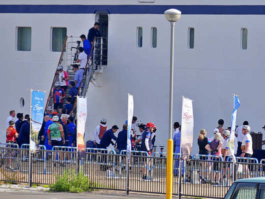 しばらくクルーズ船を眺めていたら、乗船客が続々と降り始めました。でもよく見るとサイクリング用のヘルメットを被った人達が何人もいて、普段見る外国のクルーズ船の乗船客とはちょっと雰囲気が違いますね。