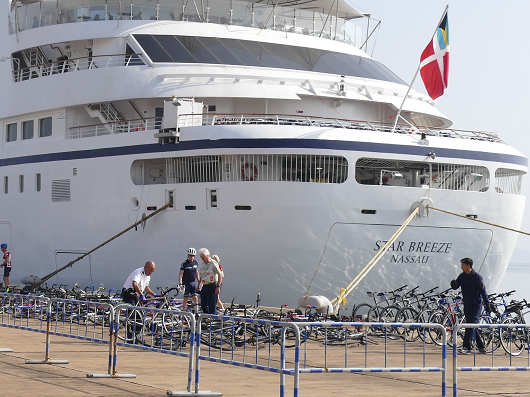 そして乗船客と一緒にたくさんの自転車も降ろされて、岸壁はあっという間に自転車でいっぱいになりました。クルーズ船「スター・ブリーズ」はラグジュアリーな船旅をする豪華クルーズ船ですが、豪華クルーズ船でも船旅には色んなスタイルがあるんですね。