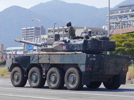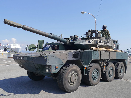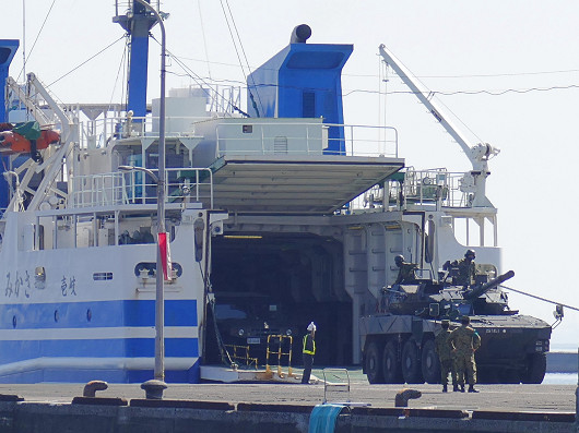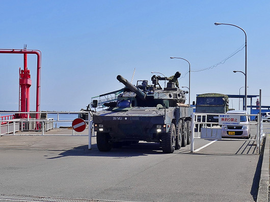 しばらく遠くから眺めていると船尾からは次々と車両が降りてきました。もうちょっと早く移動していれば目の前で見れたんですが、今から移動しても撮影に間に合いませんからね。そして最後のほうには戦車のような砲塔でタイヤが8輪ある「16式機動戦闘車」が降りてきました。まさかここでこの車両を見れるとは思わなかったのラッキーでした。