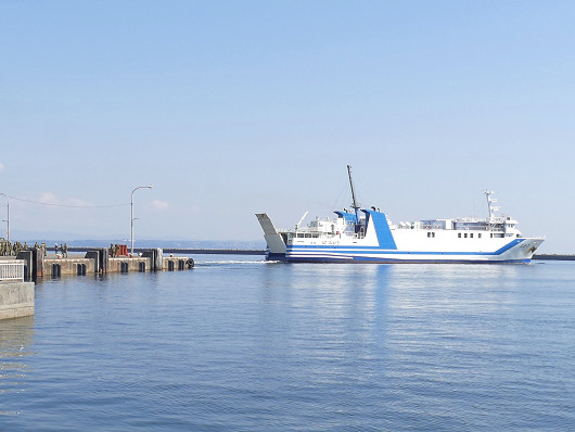 車両が全て降りてしまったところで、順光で撮影し直そうと埠頭の反対側へ行きましたが、何と「みかさ」は移動している僅かな間に埠頭を離れていました。ここは宇和島運輸フェリーが接岸する埠頭なので、四国からのフェリーが来ないうちにと大急ぎで出航したんでしょうか?