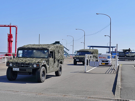 みかさが出航すると同時に、岸壁に停まっていた車両も移動し始めたので、また大急ぎで車両の出入口へと移動すると、すでに大型トラックなどは移動した後で、高機動車といわれる兵員輸送車や16式機動戦闘車が残っているだけでした。