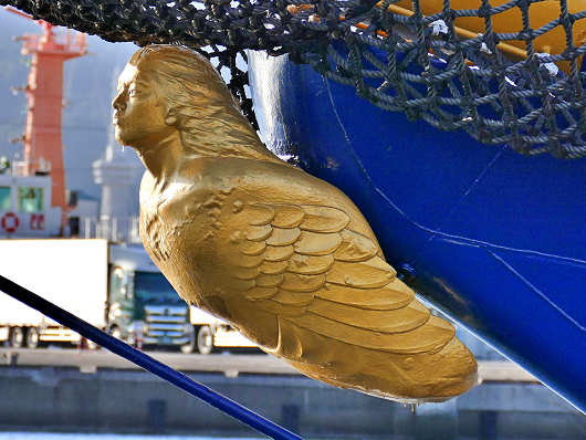 帆船・みらいへ の船首像(フギュアヘッド)です。帆船の船首像といえば日本丸の藍青(らんじょう)のように優しい女性像をイメージしますが、この船の船首像は「ヤマトタケルノミコト」なんですよね。
