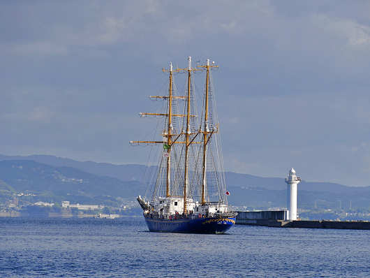 まもなく沖防波堤を廻って港外(別府湾)へ出て行こうとしている「帆船・みらいへ」です。