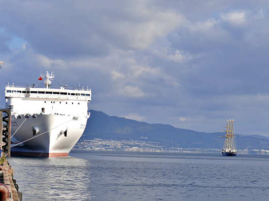 左側に停泊している大きな船は「さんふらわあ むらさき」です。この船は総トン数が17300tで全長が200mほどあるので、「帆船・みらいへ」は小船のように小さく見えますね。