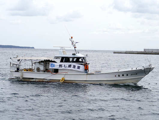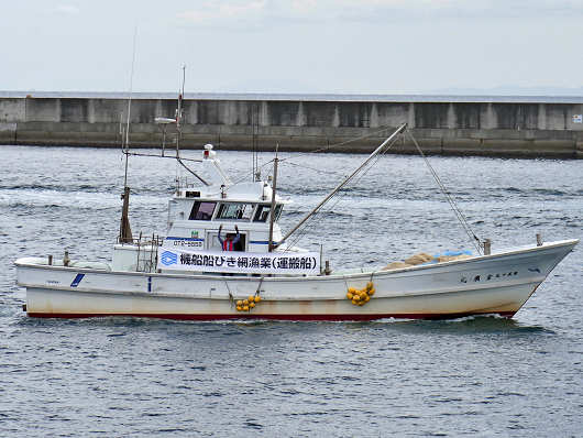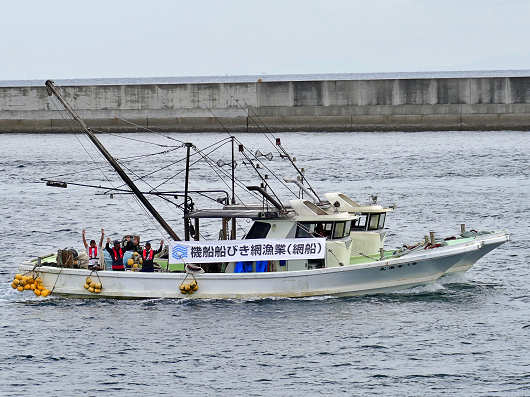 こちらの漁船が袋状の網を引っ張って漁をする網船です。画像では分り難いですが2隻の漁船が並んでいます。そして横断幕には「機船船ひき網漁業(網船)」と書かれていました。