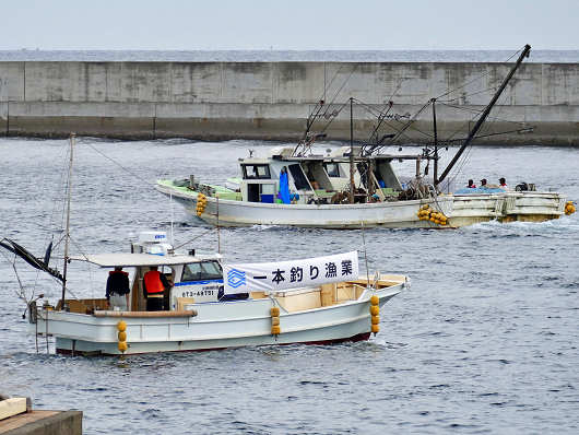 手前の船は一本釣り漁船です。一本釣りといえば大分県では豊後水道の最も狭くなった急潮の速吸瀬戸(はやすいのせと)で行われている関あじ、関さばの一本釣りが有名ですよね。