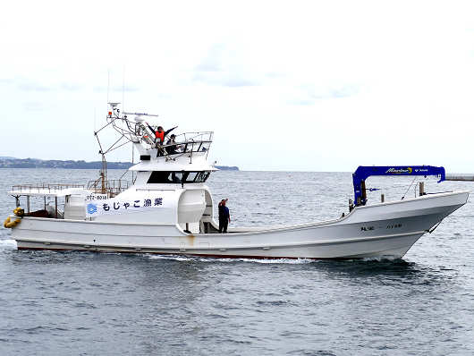 次にやって来た船には「もじゃこ漁業」と書かれていました。「もじゃこ」とはブリの稚魚のことで、養殖ブリのほとんどはこの天然のもじゃこを採取して成長させているんですよね。