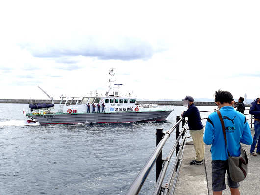 次にやって来たのは漁船じゃなくて、密漁や違法操業などを取り締まる大分県の漁業取締船「はつかぜ」です。この船には強力なサーチライトや赤外線カメラなども装備されているそうです。