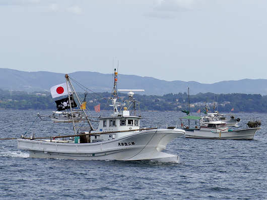 漁業調査船「豊洋」に続いては、小型の漁船が列をなすようにたくさんやって来ました。手前の漁船には不思議な旗が掲げられていたので望遠で撮影してみると・・・
