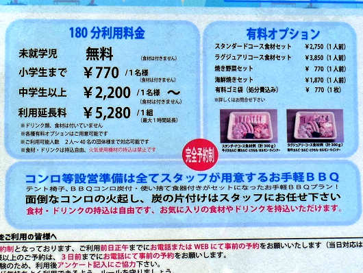 テントの周りにはこの様な貼り紙が何枚も掲示されていて、これらのテントは期間限定の有料バーベキューエリアのようでした。料金はちょっとお高いような気もしましたが、準備から片付けまでお任せなので気軽にバーベキューができていいですね。