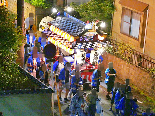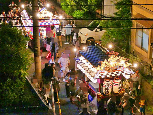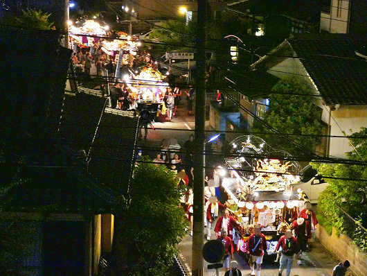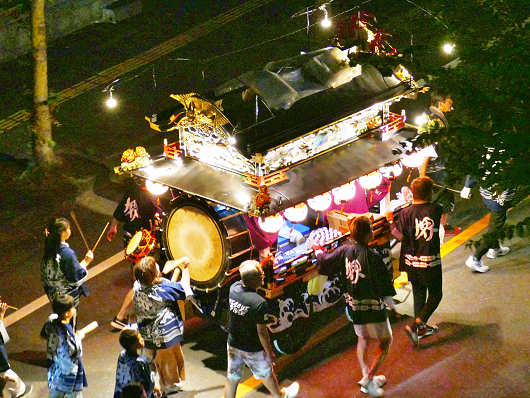 お盆が過ぎて8月下旬になっても猛暑日が続いていますが、一昨日は近所にある神社(天満社)の夏祭りがあって、曳山が我が家の前も通ったので屋上から見物をしました。