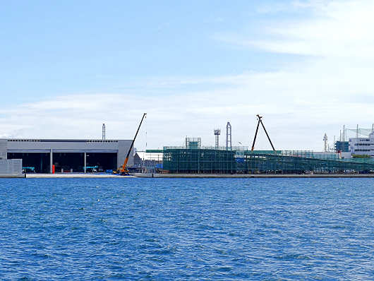 この日訪れたのは西大分港の「フェリー さんふらわー」が接岸する埠頭の先端部です。ここから東側を眺めると港を挟んだ対岸にホバークラフトの旅客ターミナルが見えます。完成予定は今年の12月なのでまだ工事の真っ最中でしたが、3隻のホバークラフトを格納する艇庫や、その前の上陸用のスロープなどはすでに完成しているようでした。