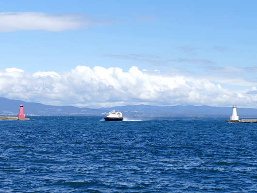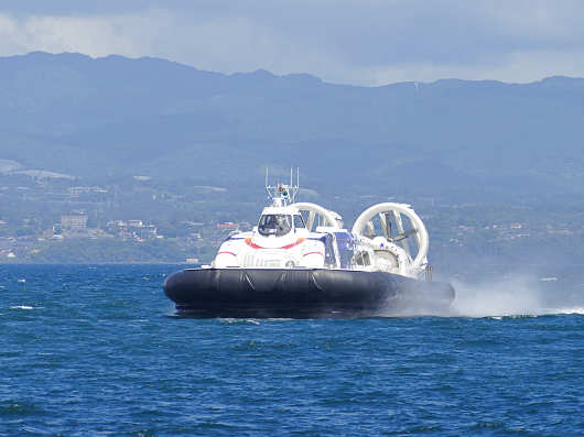 埠頭の先端部へ到着して沖を眺めながら数分も待っていると、ホバークラフトが爆音を上げながら港へと入ってきました。ホバークラフトと言えば、海上自衛隊のLCAC(エルキャック)をこのブログでも何度か載せていますが、かつて大分空港と大分市を結んでいたホバークラフトは2009年に廃止になったので、14年ぶりに見る民間のホバークラフトです。