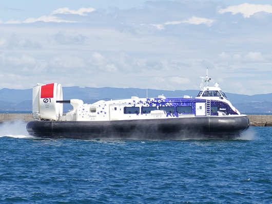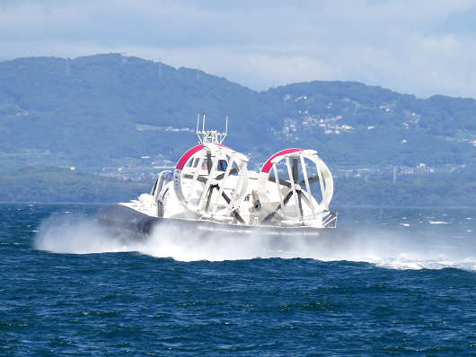 そして速度を上げると、あっという間に港を出て姿が小さくなって見えなくなってしまいました。ホバークラフトの運行を担っているのはタクシーで有名な第一交通産業ですが、HPによるとホバークラフトの最高速度は83km/h(45ノット)と載っていました。