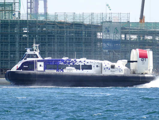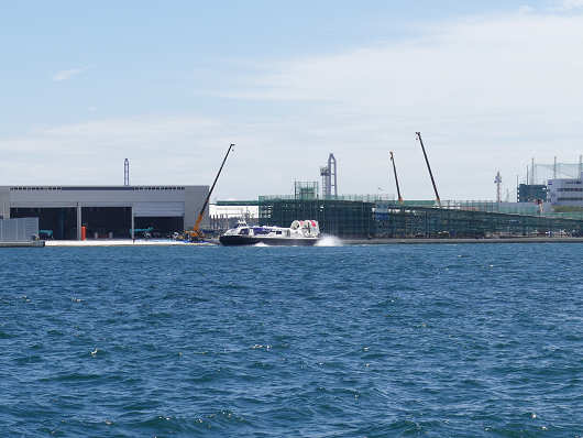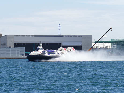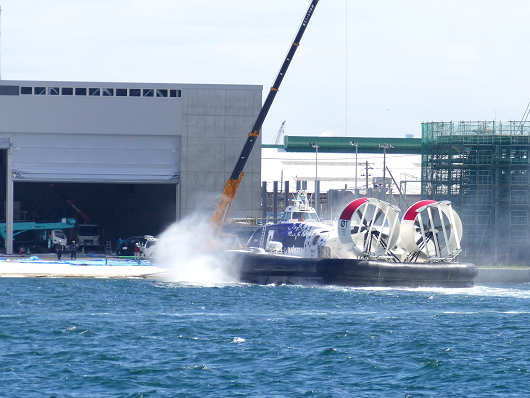 目の前を通り過ぎたホバークラフトは旅客ターミナルの前まで進んでそのまま艇庫前へ上陸するのかと思いましたが、艇庫内やその周辺では工事を行っていたので、地上ギリギリの波打ち際で停止したようでした。