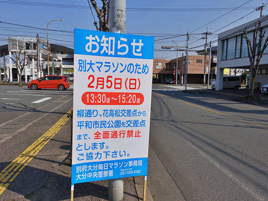 別府大分毎日マラソン(別大マラソン)はこのブログで何度も載せていますが、大分市をスタートして別府市を折り返すフルマラソンで、我が家の前の道路もコースの一部になっています。画像はお家から少し離れたところに立てられていたマラソンのお知らせの看板です。我が家のすぐ近くにも同じような看板が立てられていますが、あまり近くの看板を載せると我が家が特定されますからね(笑)