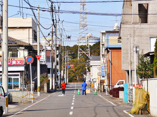 我が家の近くをマラソン選手が走るのは30km地点を過ぎた辺りと、40km地点の手前辺りの2度なので、まずは最初に選手が通過する道路へと向かいました。画像は我が家の前を走る道路から撮影しましたが、道路の先に見えている樹木の前の県道22号(通称40m道路)が30km地点を過ぎた辺りになって、我が家からは400mほどの距離なんですよね。