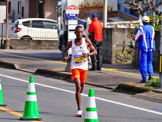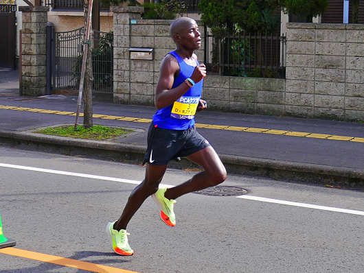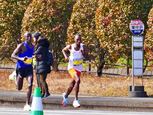 そして先行車に続いて報道関係の車両が通過すると、その後ろから先頭の二人の選手がやって来ました。ゼッケンを見ると2番と3番の選手だったので、海外招待選手でジブチのイブラヒム・ハッサン選手と、ケニアのダニエル・キプチュンバ選手でした。
