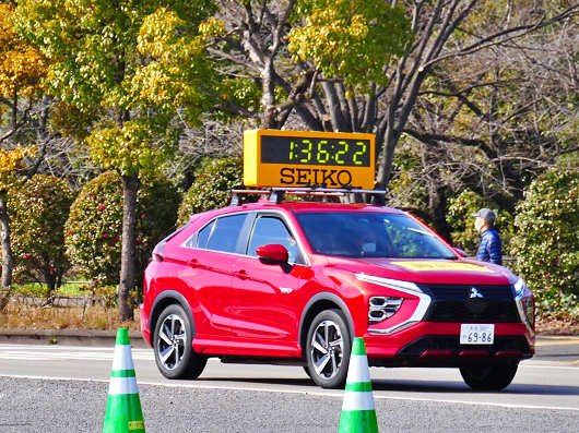 先頭の2選手に続いてやって来たのは、タイムを表示した車でした。県道22号は片側3車線の広い道路なので、道路を渡った向こう側に行けば選手を間近に応援できるんですが、一旦渡ってしまうとしばらくは横断禁止になるので、我が家の前の道路へと戻れなくなるんですよね。