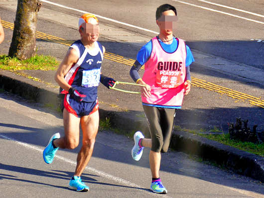 一般参加の選手に交じって視覚障がい者選手もガイドランナーと一緒にやって来ました。