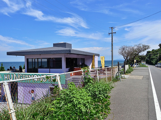 この画像は大分市街地方面から撮影したものですが、国道197号を佐賀関半島に向かって走っていると、途中から海岸沿いを走る道になって、小さなお店がポツンと一軒だけ建っているのが見えてきます。ここがこれからランチをいただく大分市本神崎の「ハングリー モンスター」です。