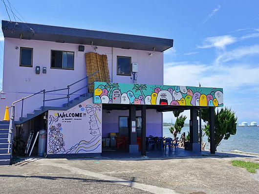 駐車場は国道から一段下がった海岸沿いにあるので、ここに車を停めてさっそく店内へと向かいましたが、ハングリー モンスターは以前はカラフルなキッチンカーで営業をしていたお店で、現在の海岸沿いにあるこのお店も外観はとってもカラフルな建物です。