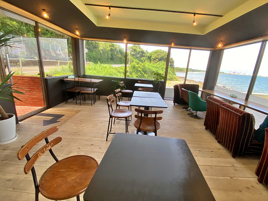 店内はこんな感じで三方が大きな窓の明るい店内で、海に面した窓からは別府湾が一望できる絶景のロケーションです。