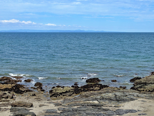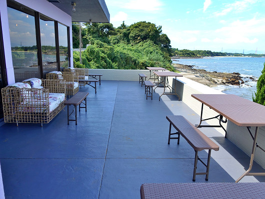 テラス席からは正面にこの様な光景が見えて、食事前や食後に磯遊びをするのも楽しそうですね。遠くに薄っすらと見える陸地は国東半島です。