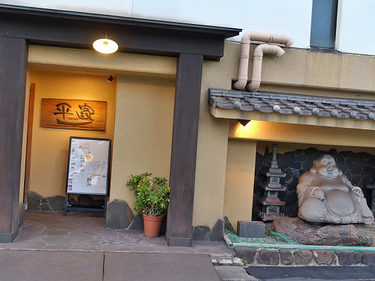 この日訪れたのは、お家から歩いてすぐのところにある「日本料理 平家」です。ここはこのブログで何度も紹介しているお店ですが、いつも外観は入り口付近だけしか撮影していないので、今回は入口の横にある商売繁盛にご利益のある布袋様の石像も一緒に撮影してみました。