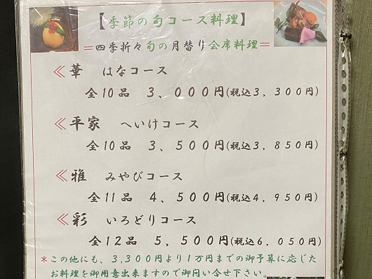 ここでは予算に合わせて色んな料理を注文できますが、今回は季節の旬コース料理の中から「平家 へいけコース」を事前予約しました。