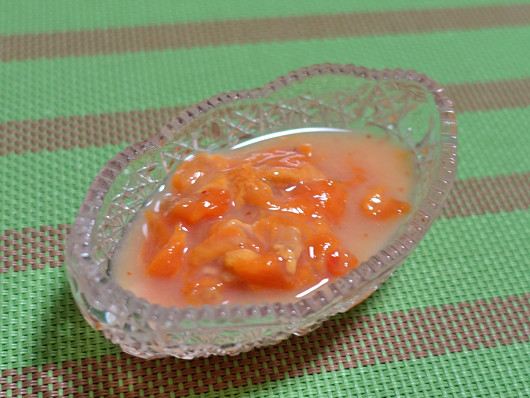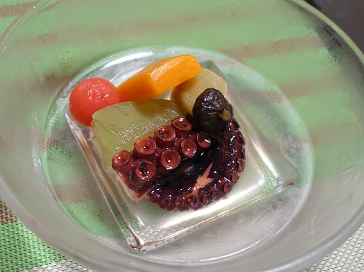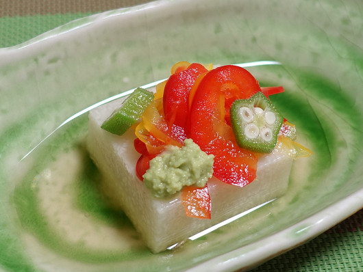 ここでは一品ずつ料理が運ばれてきますが、最初に運ばれてきたのは長芋の寒天寄せとパプリカのお浸しです。