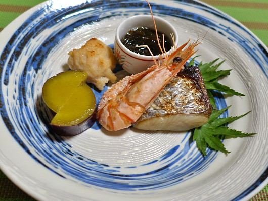 焼き物はサワラの西京焼き、エビ、野菜、そしてモズク酢もありました。
