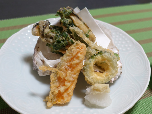 岩ガキの磯部揚げと季節の野菜の天ぷらです。岩ガキも夏が旬ですがもうすぐ終わりですね。