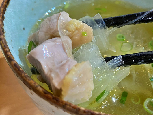 鶏スープにも軍鶏肉がゴロゴロ入っていて、まさに軍鶏づくしの定食でした。最初は他のランチメニューに比べて1280円はちょっとお高いかな?と思っていましたが、お腹もいっぱいになったし、軍鶏肉を使った料理でこの内容なら納得ですね。