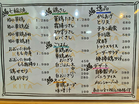これは「軍鶏七輪焼 KITA」の夜のメニューです。七輪焼の他にも軍鶏たたき、レバさし、一品料理と焼き物以外のメニューも豊富なので、近いうちに夜も訪れてみたいですね。