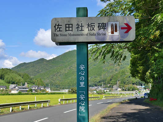 安心院町の町中からは東九州道の安心院ICの前を通り過ぎて5㎞ほど進むと「佐田社 板碑」と書かれた標識が見えてくるのでここに車を停めました。板碑とは供養塔の一種ですが、今回は別の目的でここをここを訪れたので板碑については紹介しません。