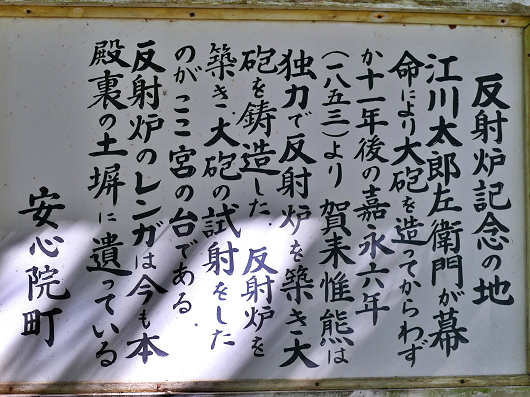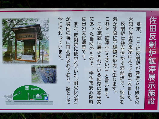 ここにはこの様な説明板もあって、幕末の安心院は島原藩の飛び地で、島原藩に仕える賀来惟熊(かくこれたけ)という人物によって、ここに金属を溶かす反射炉が建造されて、大砲などの製造が行われていたそうです。