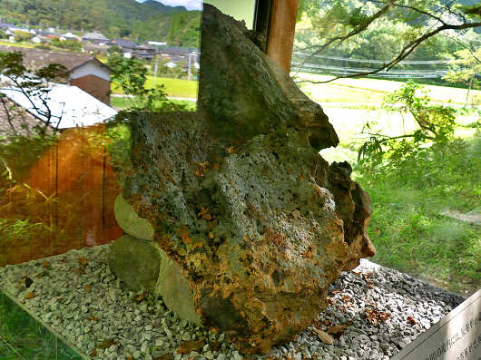 ガラス越しに中を覗いてみると、表面にぶつぶつと小さな穴が開いた大きな岩のようなものが一つ置かれていました。これは鉱滓(こうさい)といって鉄を溶かした時に残る不純物の塊で、実際に佐田反射炉から出たものだそうです。