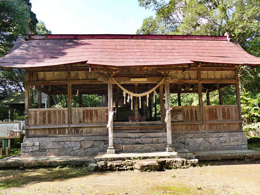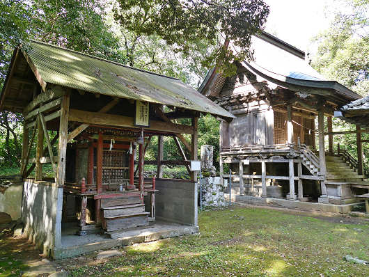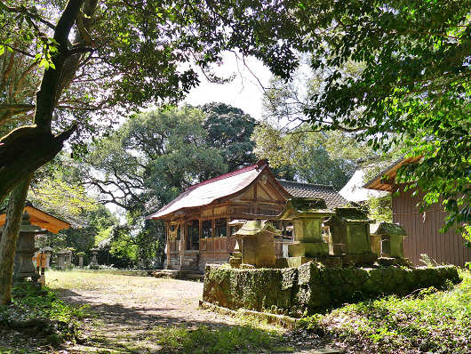 拝殿の横に廻ってみると末社があって、その向こうに佐田神社の本殿が見えました。反射炉に使われた耐火煉瓦はこの本殿の裏側にあります。
