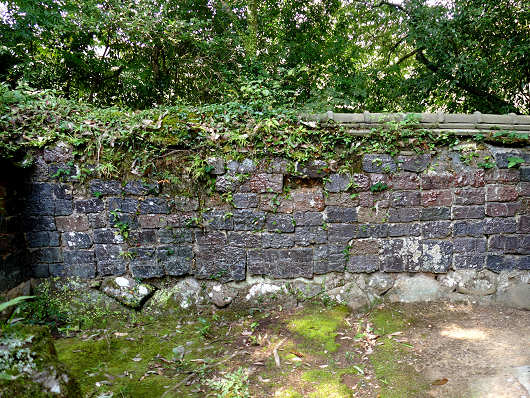 本殿の横へ行ってみると柵があって裏には廻れませんでしたが、黒っぽい色をした塀が続いているのが見えました。