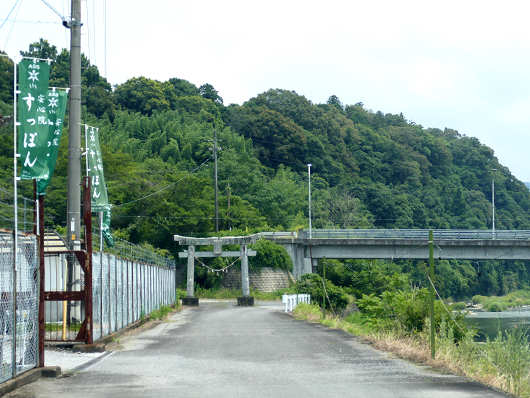 下市百穴はちょっと残念な結果でしたが、駐車場に戻ったら車で少しだけ移動して新貝川の河川敷に車を停めました。画像の左側に幟が立っているところはスッポン養殖場の「安心院すっぽんセンター」で、正面に見える鳥居はその向こうの森の中にある「三女神社」の一の鳥居です。駐車場(空き地?)はこの鳥居を潜った先にあります。